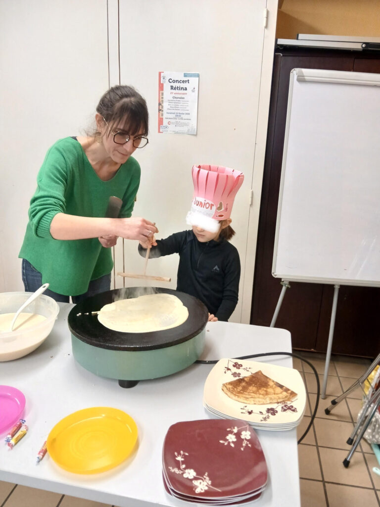 Après la fabrication de la toque du super pâtissier, chacun s’est lancé à faire des crêpes avec le billig de Christelle (merci à elle !), moment très convivial avec les parents qui sont venus récupérer les enfants plus tôt pour profiter du goûter de la chandeleur